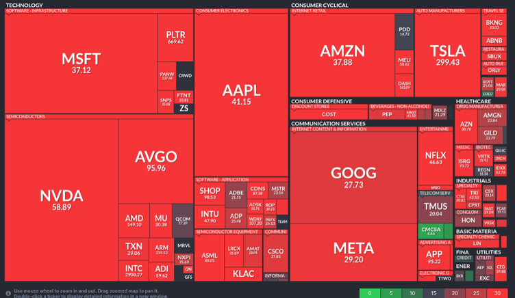 Price-to-earnings rations for Nasdaq 100 stocks, including Palantir