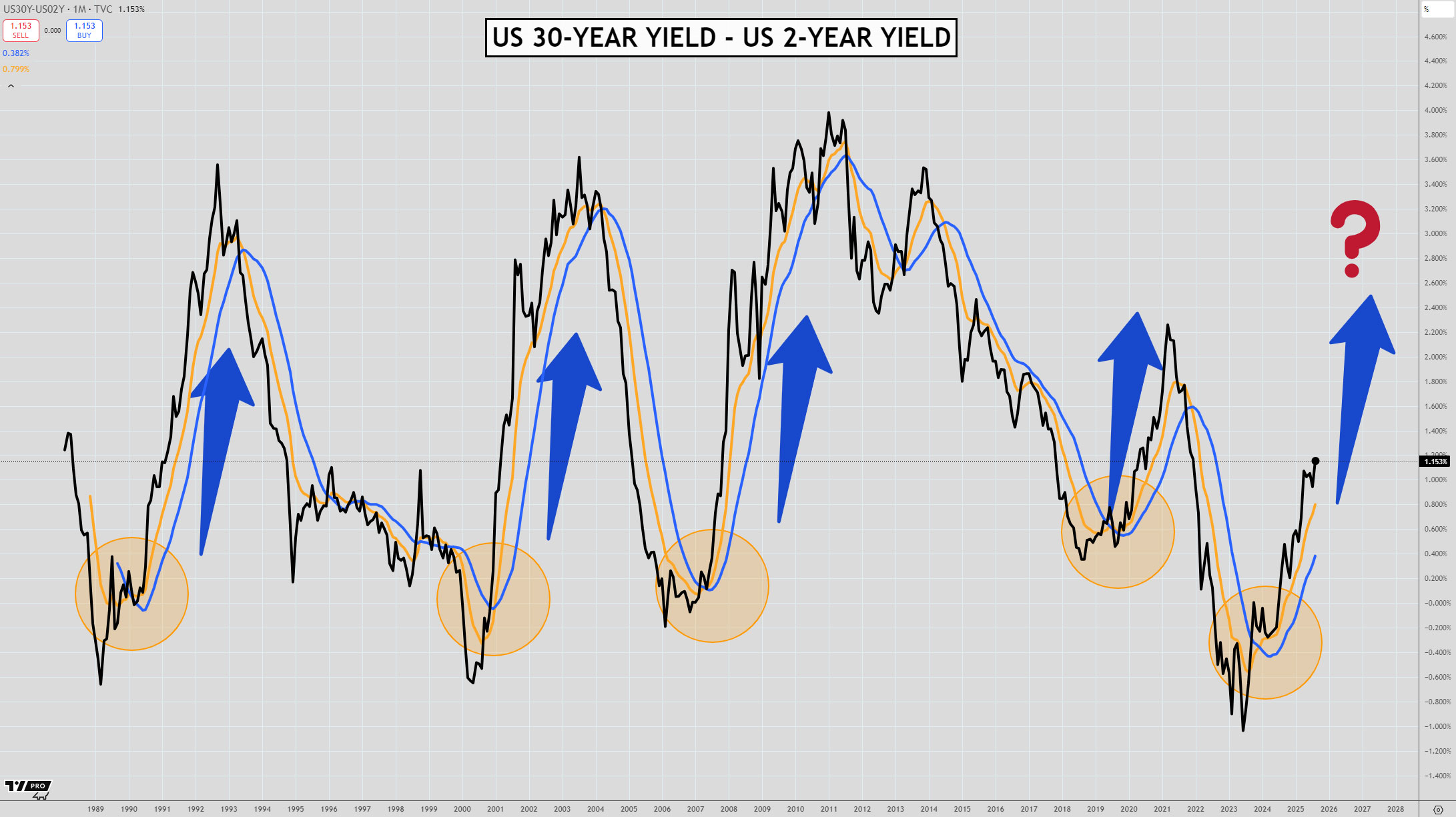 With inflation bubbling away as a result of Trumps tariffs and immense pressure on the Fed to cut rates as employment figures disappoint we may be on the cusp of seeing the yield curve steepen even further.