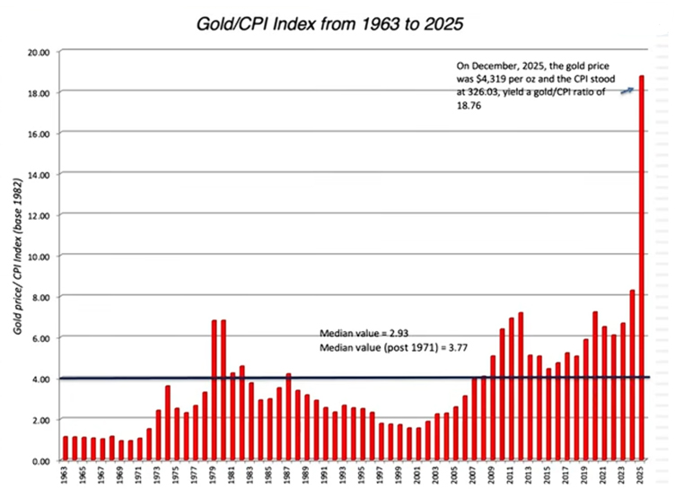 Just take a look at this chart below. Measuring gold relative to CPI (inflation) has been a traditional yardstick for judging gold as an inflation hedge.
