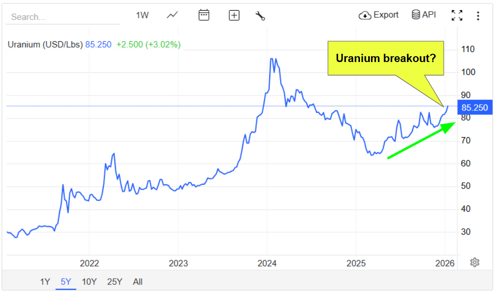 And then, in the last couple of weeks, uranium’s quietly broken out again, pushing into the mid-US$80s, its best levels since 2024.