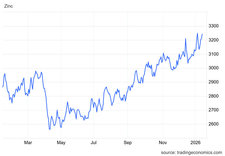Zinc is trading at around US$3,230 per tonne, over the last 7 months, the trend is steadily up.