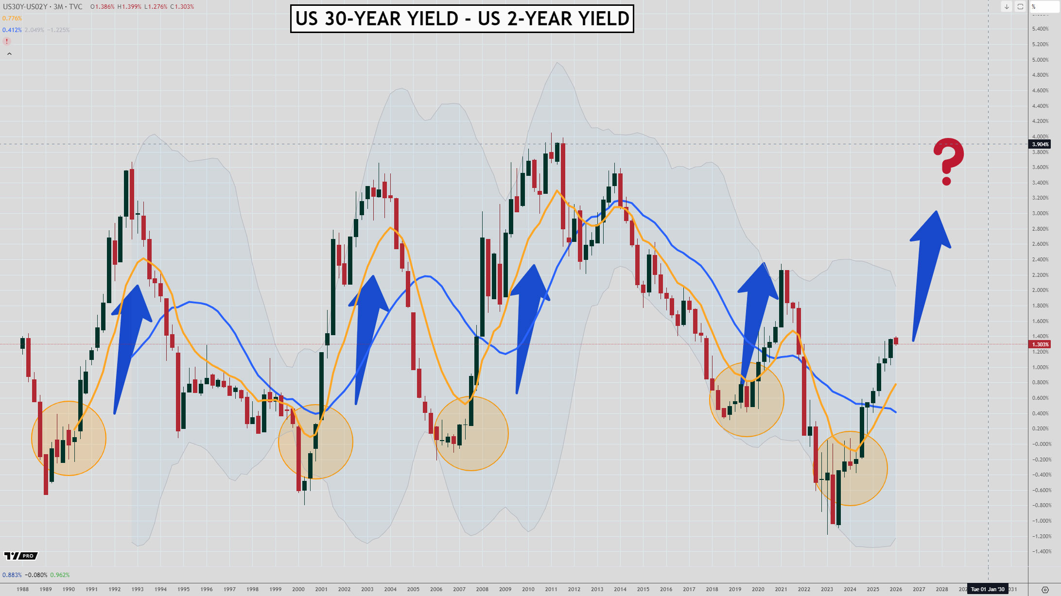 The thing to note is that the current steepening shows no signs of weakening, and past steepening periods usually continue to much higher levels (close to 4% from the current 1.3%).