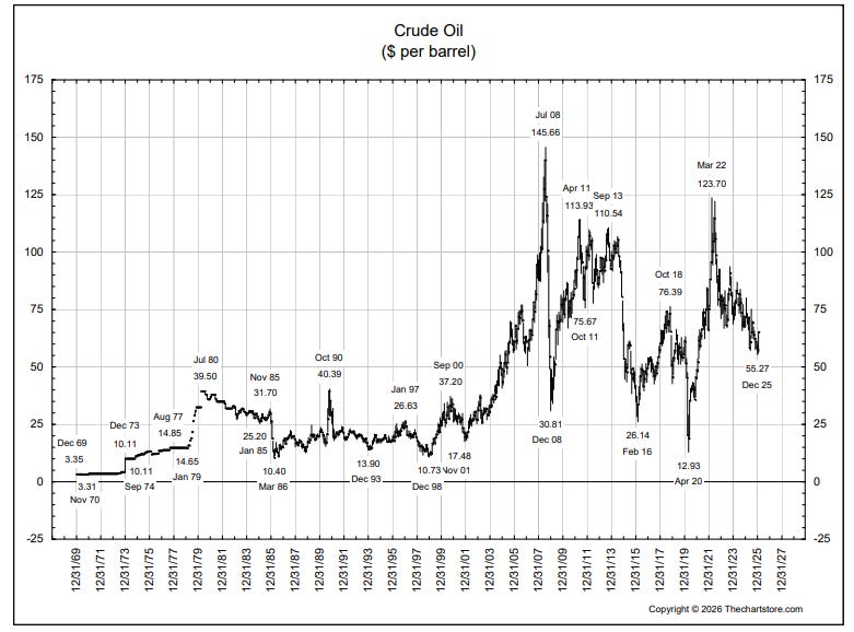 In May of ‘22, you could buy a barrel of oil for $114. Now, it’s about $66. And all this talk of going to war with Iran doesn’t seem to have made much of a difference. For the last 20 years, the price of oil has gone nowhere.