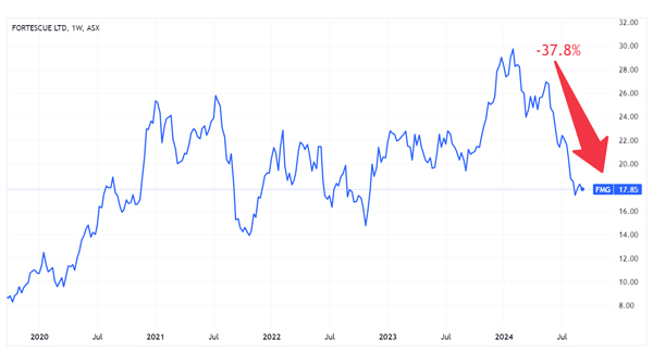 Not surprisingly, Australia’s premier iron ore producer, Fortescue Metals [ASX:FMG], has tanked almost 40% over 2024: