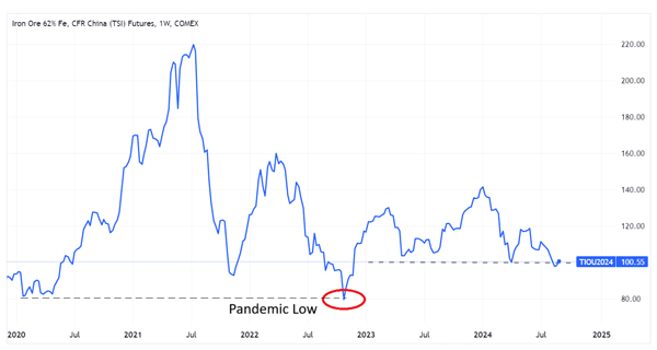 But breaking below US$100/tonne, could see a sharp correction to around US$80/tonne (red circle above), the pandemic low from 2022.