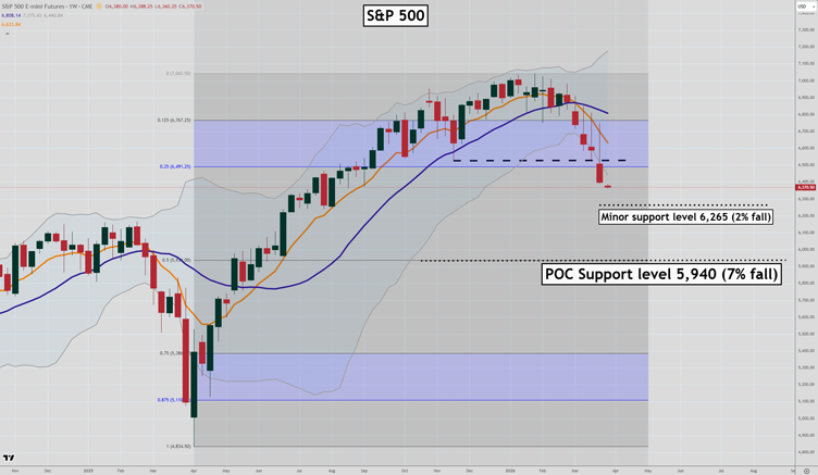 If the war rages on, we could see the S&P 500 drop another 7% quite quickly, to the midpoint of the last up wave near 5,940.