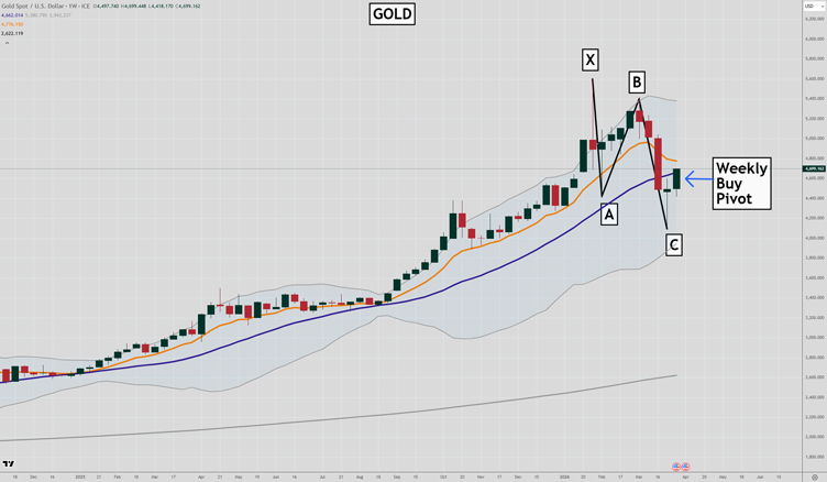 A simple reading of the state of play is that gold remains in a weekly uptrend, and an ABC overlap will occur if a weekly buy pivot is confirmed.