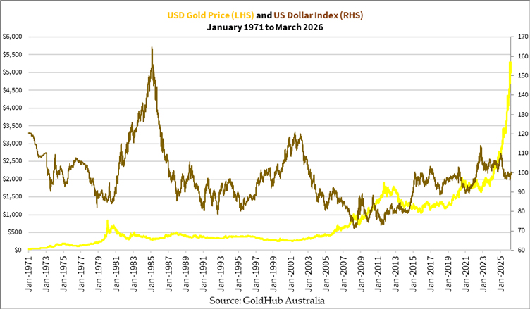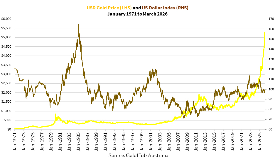 It’s possible for both gold and the US dollar to rise together. However, this usually happens briefly as it reflects a period of acute distress, such as a financial crisis or major catastrophe. The increase in both the price of gold and the value of the US dollar comes from a flight to safety, when people sell other assets they hold for gold and the dollar. We saw this happen 1980 as inflation gripped the world after a decade of oil crises, in 2008-09 during the subprime crisis, 2020 as the world locked down, and briefly last year amidst the Israel-Iran conflict.