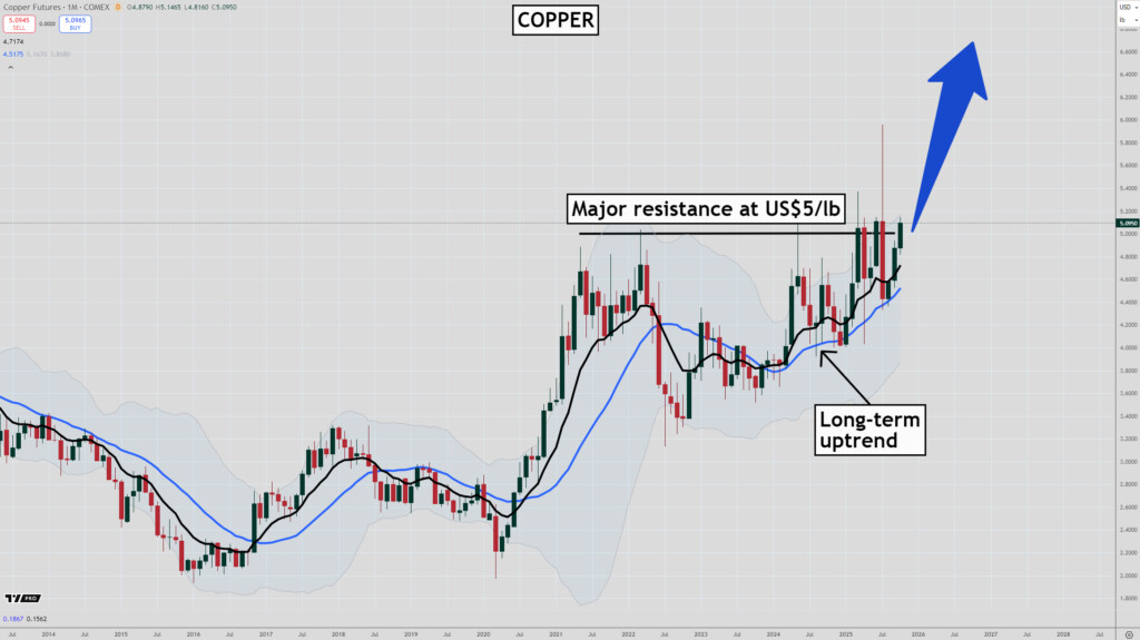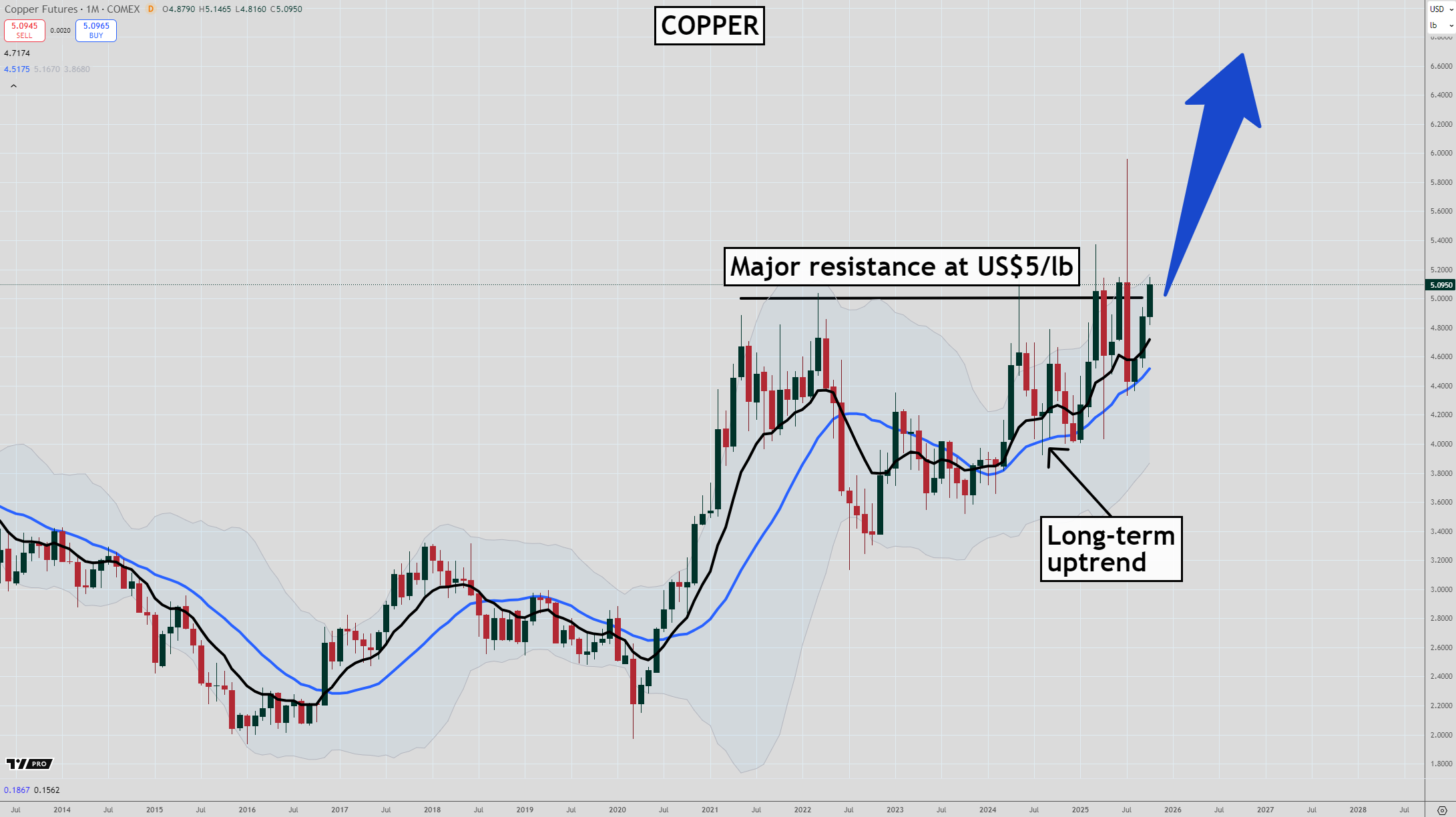 After the scare a few months ago saw copper plunge back to the 20-month simple moving average we have seen steady buying support. Prices are now testing US$5.00/lb once again with the odds looking good that buyers will finally overwhelm the sellers and a solid uptrend will take place.
