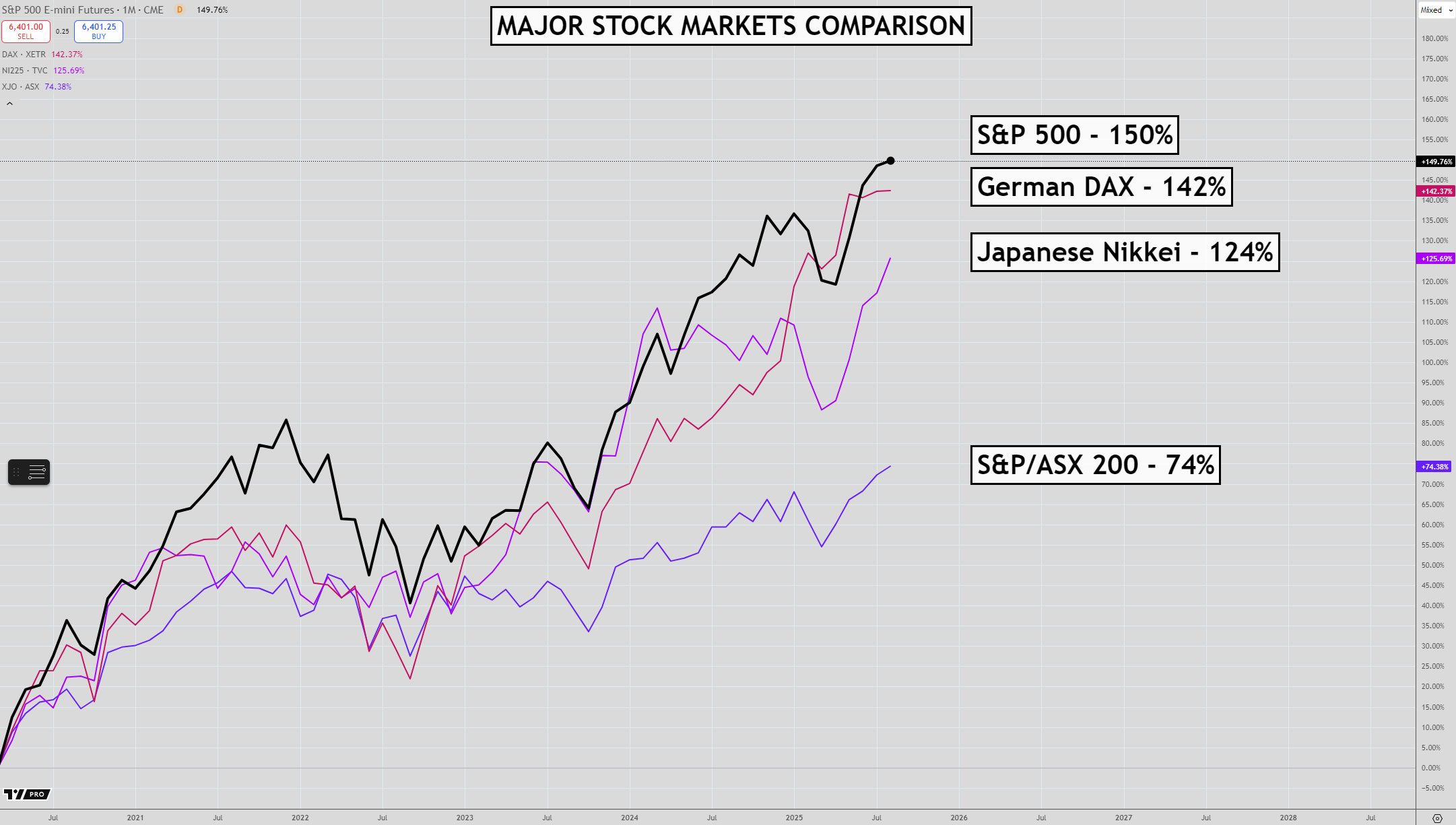 US, German, and Japanese stocks are up between 124-150%. It is positive that all three markets are rising in unison.
