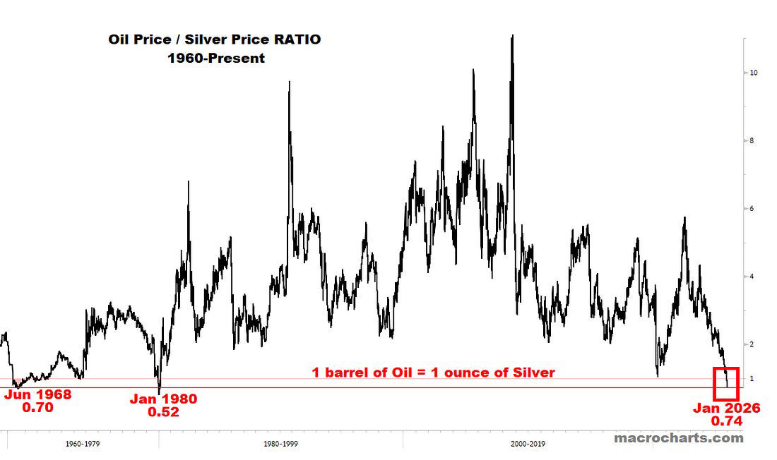 Oil is now trading below silver for only the third time in seven decades. This isn’t normal. History suggests it doesn’t stay this way.