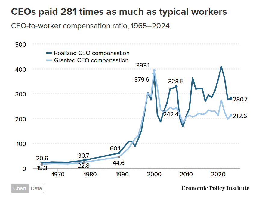 While manufacturing jobs were being lost in droves. CEO pay soared to many hundreds of times the typical worker’s pay.