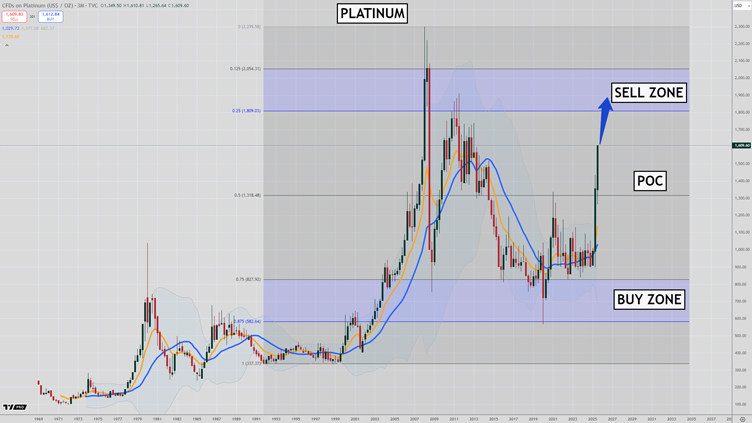 Recent price action has seen a breakout above the POC which gives targets to the sell zone of the wave between US$1,800-2,050.