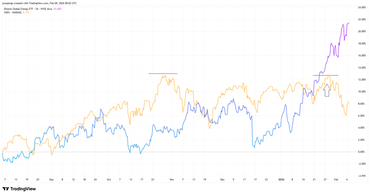 Well, here’s a chart comparing the Nasdaq 100 Total Return Index (orange) versus the iShares Global Energy ETF [NYSE: IXC], shown as purple: