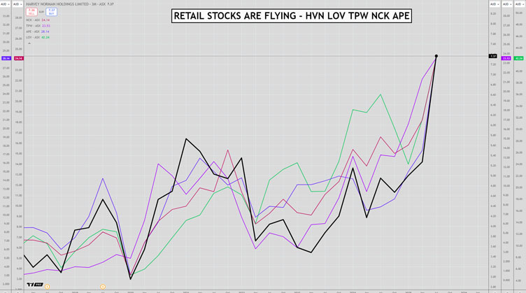 Fashion jeweller Lovisa Holdings [ASX:LOV] is up over 100% since April. Furniture retailers Nick Scali [ASX:NCK] and Temple and Webster [ASX:TPW] have been in a strong uptrend for the last couple of years but recent results saw the buying accelerate.