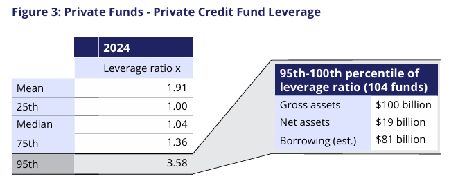 And within these private credit groups, the average leverage was 1.91x — not dire on its own. However, the edge cases are where the trouble lies. At the 95th percentile of lenders, leverage hits 3.58x.