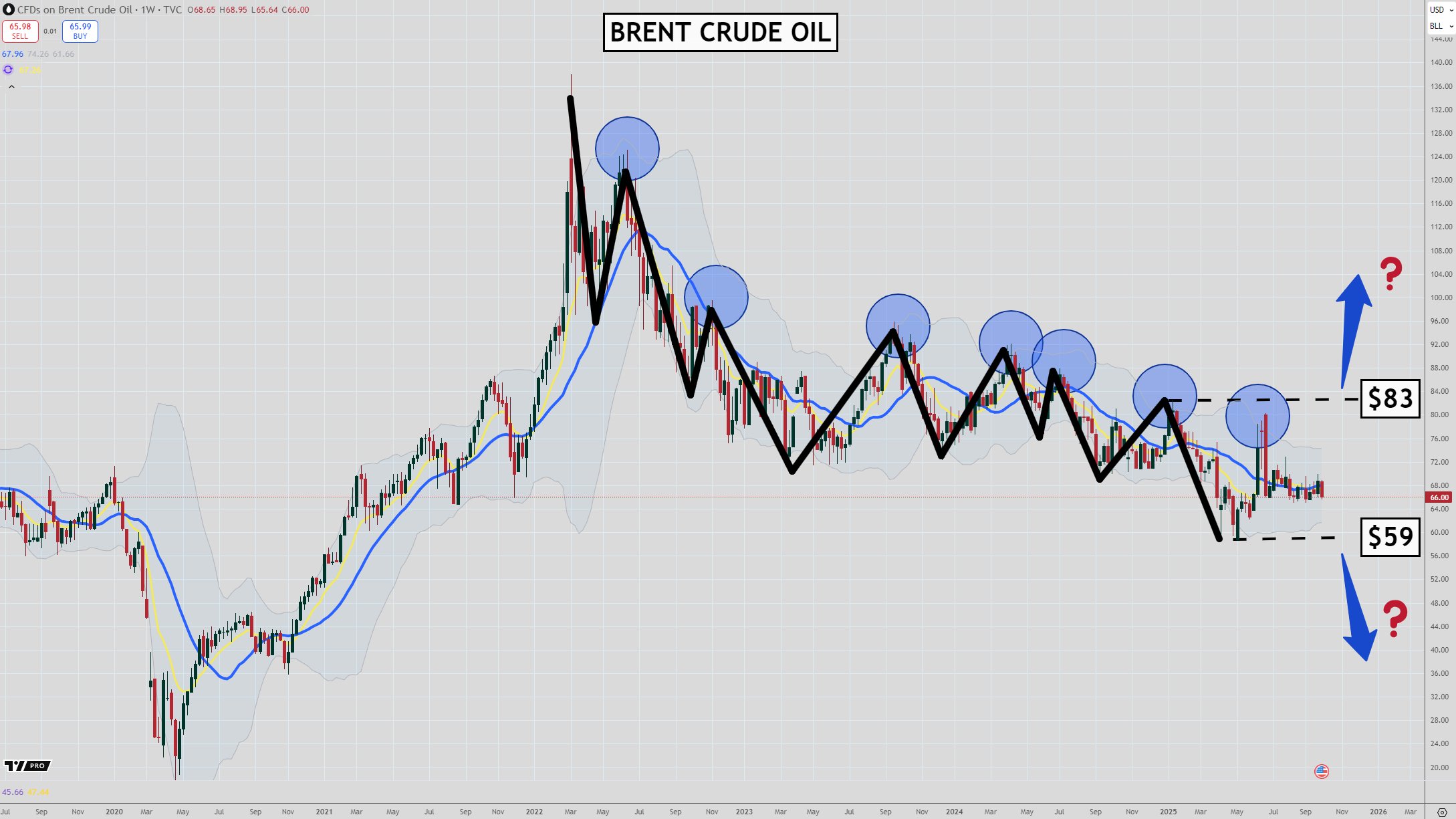 If we see a continuation of the downtrend and prices head below the low of the bear market near US$59.00, the next leg down could be a doozy.