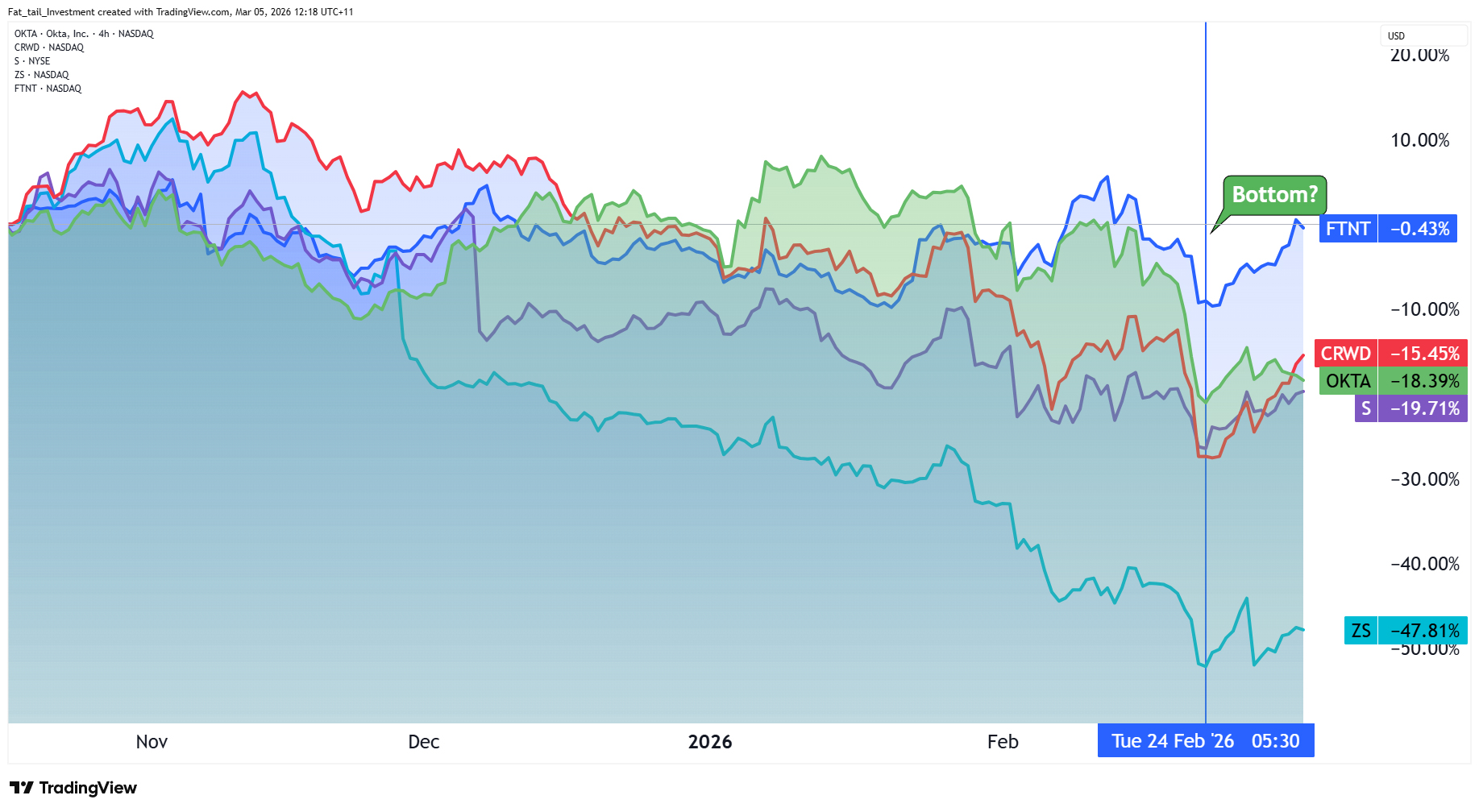Palo Alto Networks, SentinelOne, Zscaler, and Fortinet are worth watching in the same breath. They have all collectively bounced since their lows last week.
