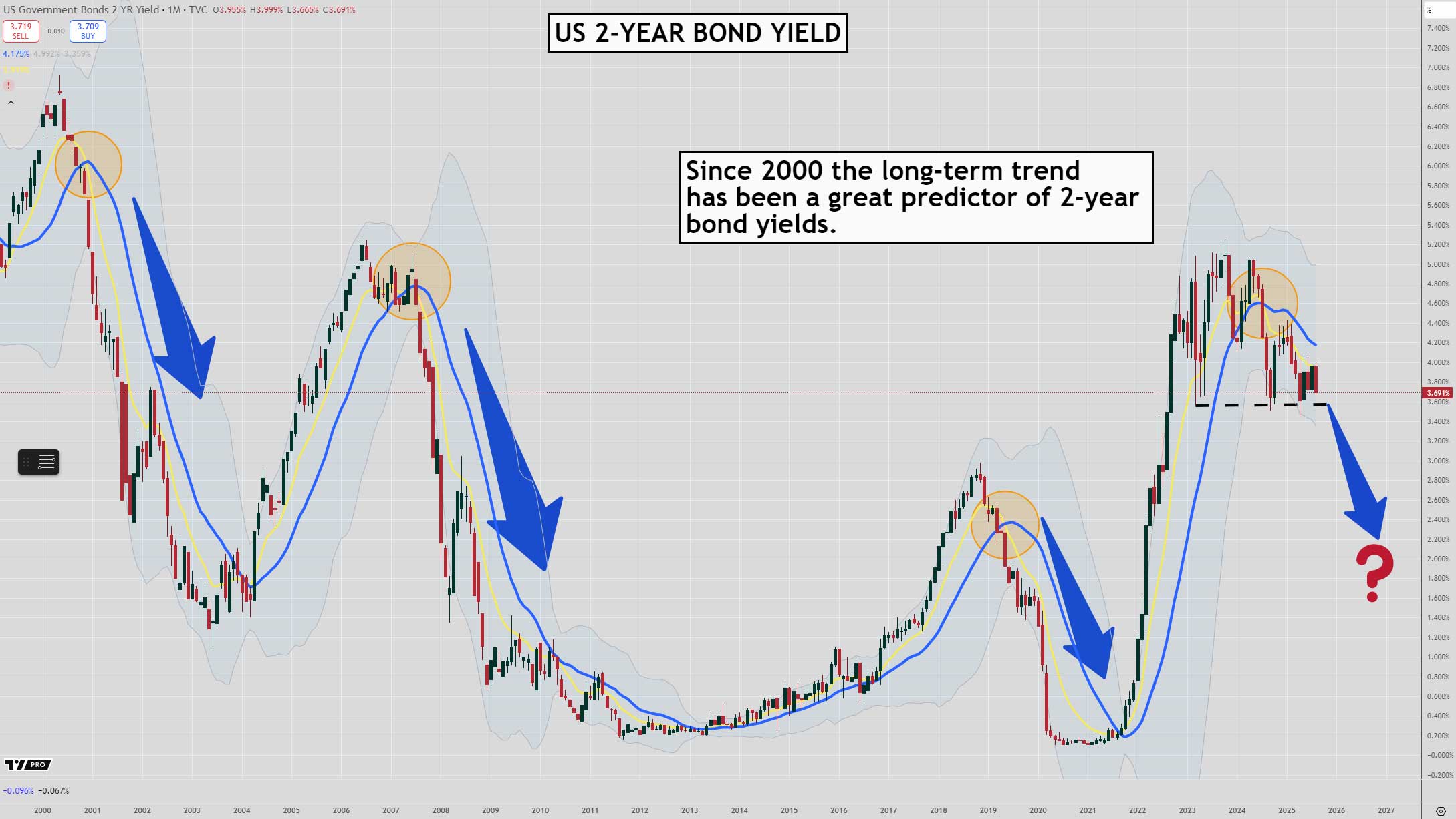 The above chart shows you a monthly chart of the 2-year bond yield (remember prices move inversely to yields).